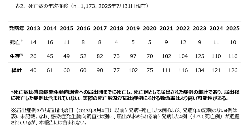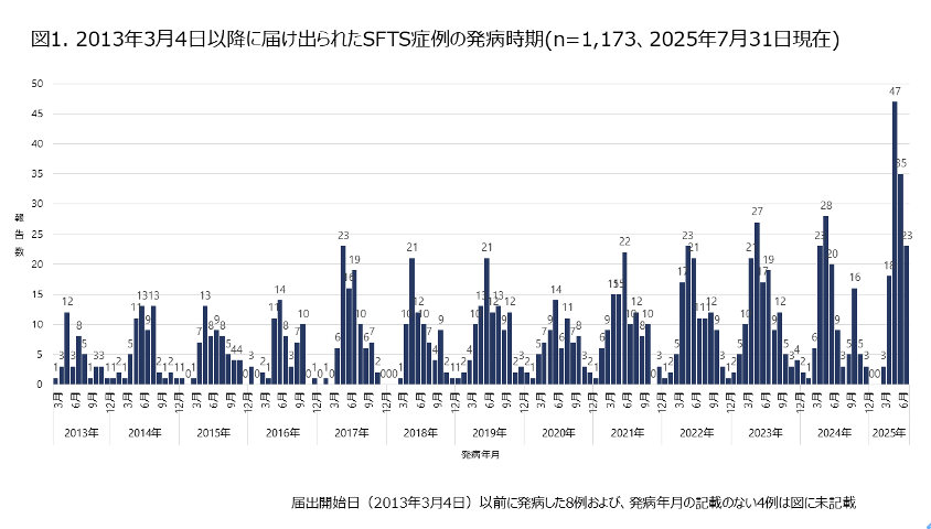 SFTSは、Severe Fever with Thrombocytopenia Syndrome(重症熱性血小板減少症候群)の略だ。2013年1月、山口県で日本初の感染者(50歳代女性、前年の秋に発症して死亡)が確認された。病原体は新種のウイルスで、このSFTSウイルスが感染者の血液などの体液に含まれ、それに接触して感染し、発症すると、高熱が出て下痢、下血、嘔吐、けいれん、意識障害を引き起こすとともに血小板や白血球が減少する。感染者の9割が60歳以上だ。多臓器不全で死亡するケースがあり、2013年3月から2025年7月までに届け出のあった死者数は122人で、致死率は27%とかなり高い。