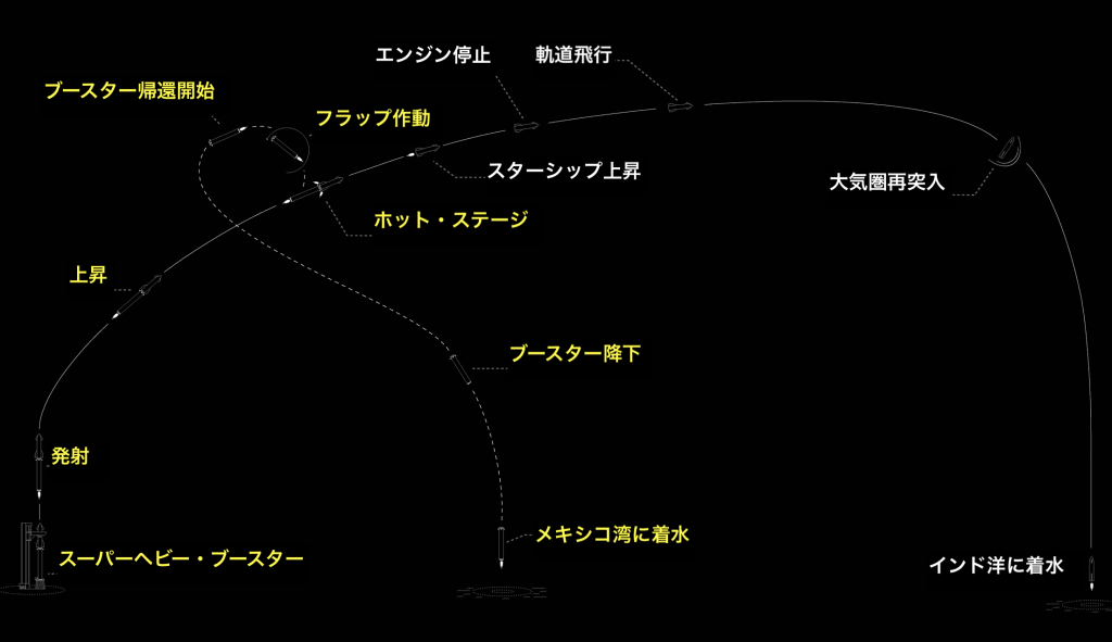 図1:(SpaceX)10月13日夕刻、テキサス州宇宙基地から11回目の試験飛行として出発、予定した全ミッションを完了して、スターシップはインド洋、ブースターはメキシコ湾、それぞれの予定点に軟着水、帰還した。