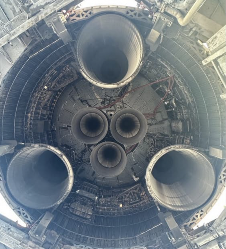 図6:(SpaceX)スターシップ側のラプター・エンジン取り付け状況。外側3台が海面上エンジン、内側3台は真空用エンジン。