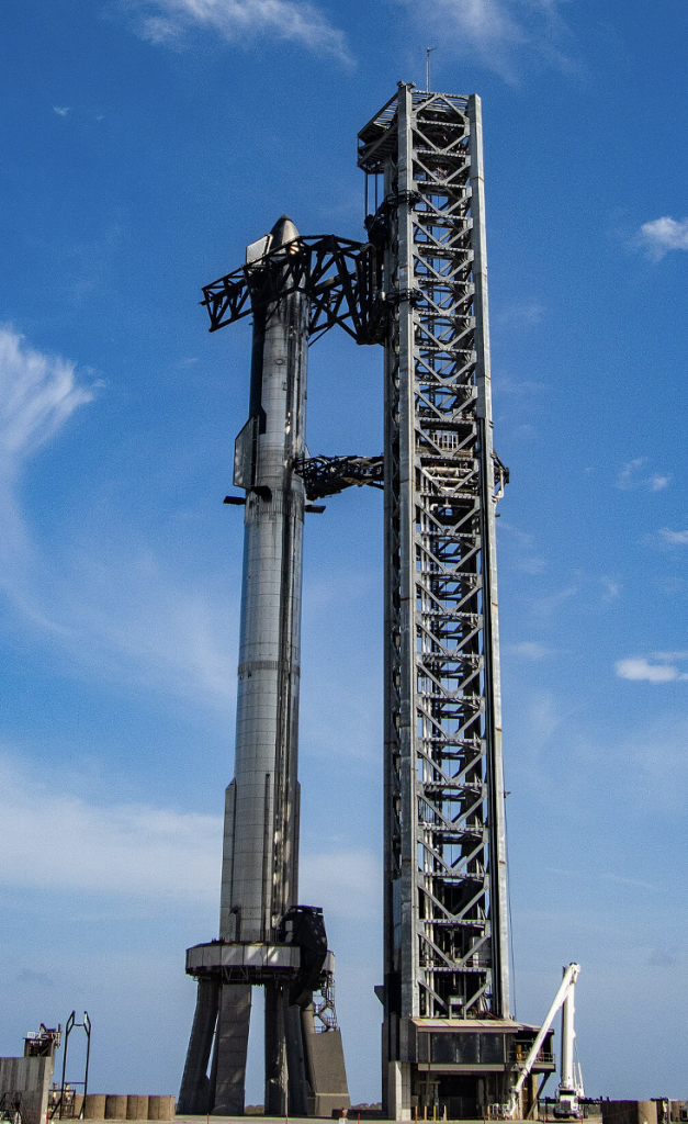 図3:(SpaceX/Supercluster, by Jenny Hautmann) テキサス州ボカチカのスターベースで、2023年4月発射を待つ「スーパーへビー・ブースター7号機とスターシップ24号機(いずれもV2型)。この飛行は失敗に終わったが、今回の11回目試験飛行と同じ構成なので掲載する。