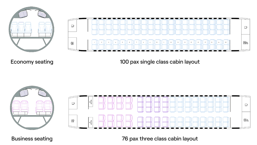 図4:(MAEVE Aerospace)マエブMJ 500の座席配置図。100席全エコノミー仕様と3クラス76席仕様を示す。胴体直径はCRJ系列機より大きくなる。