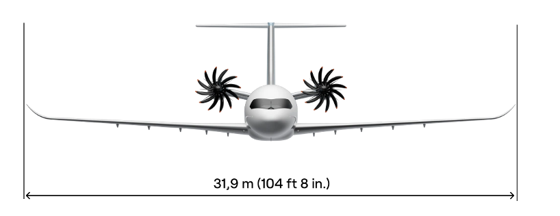 最大離陸重量 34 ton、最大ペイロード 9.7 ton、航続距離は3クラス乗客76人の場合2,685 km、2クラス乗客90人の場合は1,759 km、巡航速度はマッハ0.78、飛行高度は最高の場合37,000 ft。エンジンは後述のハイブリッド電動ターボプロップでスイール・リカバリー・ベーン付きを2台装備する。