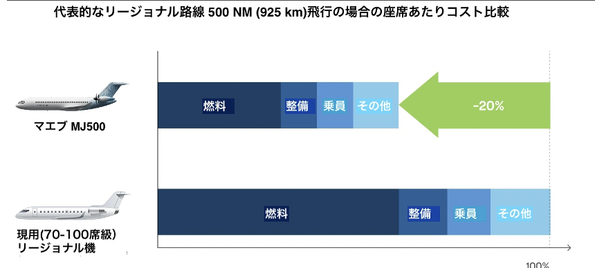 図5:(MAEVE Aerospace)MJ500と現用の70-100席級のリージョナル機(CRJを指す)との座席あたりの運航コストの比較。