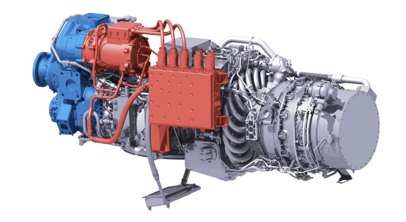 図8:(RTX) EUの[PHARES]計画に対応するP&WC 「PW127XT」改良のハイブリッド電動エンジン。左の「青色」はプロペラ駆動用の減速ギヤボックス。これに「赤色」コリンズ製250 kW電動モーターを取付け発電する。後ろの四角い箱はコントローラー・パックで、バッテリーなどを内蔵している。