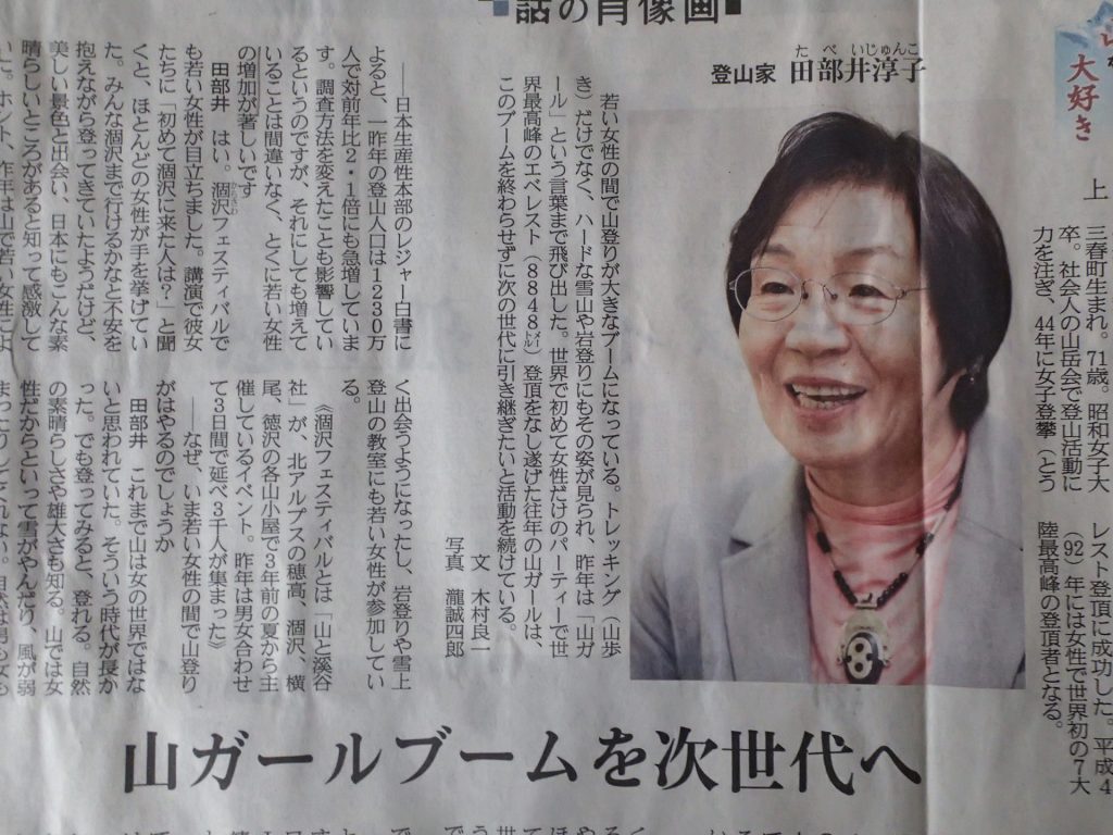 いまから14年ほど前のことである。田部井さんを取材し、産経新聞の朝刊にインタビュー記事(上・中・下)を3日続けて掲載したことがあった。当時の取材テープの録音を聞くと、あの懐かしい福島弁の声が聞こえてくる。田部井さんの事務所(東京都千代田区三番町)を訪れたのは、2011年1月14日と27日だった。当時、私は登山を始めたころで、奥多摩や丹沢の低山を毎週のように登っては足腰を鍛えていた。井上靖の『氷壁』や新田次郎の『孤高の人』などの登山小説にも夢中になっていた。そんな時期だったから日本の登山家を代表する田部井淳子さんに会って取材できるという嬉しさと緊張感で、取材日程を2日も入れたのだと思う。田部井さんの方は講演をこなしながら世界各国でその国の最高峰を登り続けるなど、忙しい毎日を過ごしていた。長い取材は迷惑だったに違いないが、田部井さんは笑顔で受け入れてくれた。