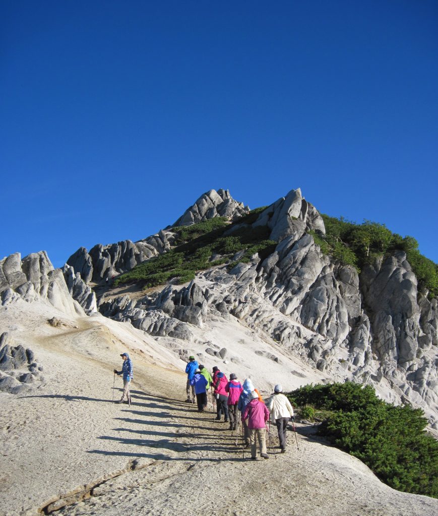 早朝、北アルプス・燕岳(つばくろだけ)の頂上を目指す。青い空と白い花崗岩とのコントラストに圧倒される=2012年9月13日、撮影・木村良一