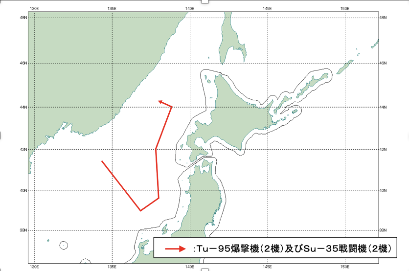 10月24日午前、ロシア戦略爆撃機 Tu-95 2機が護衛戦闘機Su-35 2機を伴い、シベリアから佐渡島沖合の空域に飛来、反転して我国領空に沿い北上、北海道沿岸空域からシベリアに向かった。