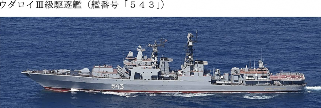 10月5日夕刻、ロシア海軍ウダロイIII級駆逐艦(543)、ステレグシチーIII級フリゲート(337)、ボリス・チリキン級補給艦の3隻が、東シナ海から沖縄県西表島と与那国島の間の海峡を通り太平洋に向け航行した。3隻は10月3日対馬海峡経由東シナ海に入ったもの。