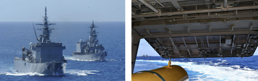 図21:(統合幕僚監部)左は手前「うらが」、奥が「さわぎり」。右写真は「うらが」の艦尾ドアを開けたところ、黄色の物体は機雷探知用掃海具。
