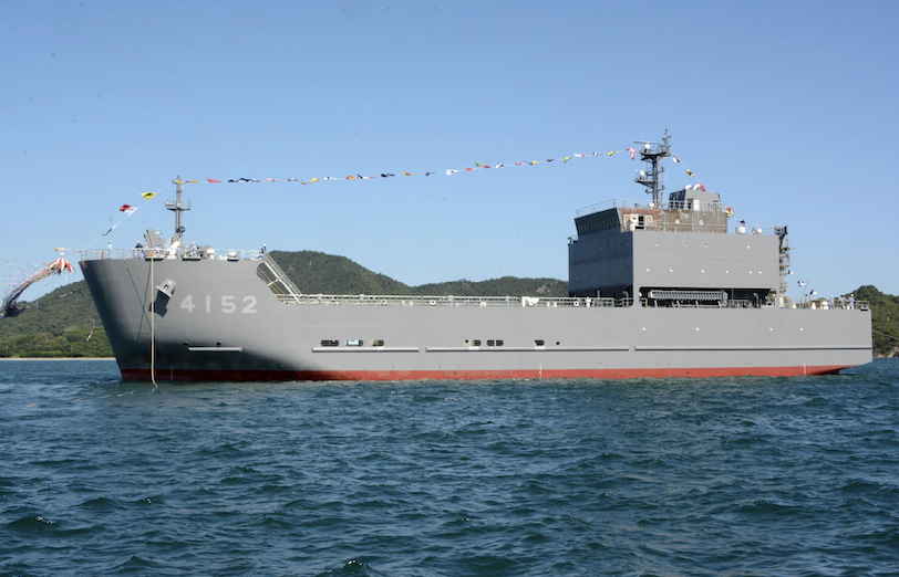 図24:(防衛省)上陸用輸送艦(LCU)2番艦「あまつそら (4152)」、基準排水量2,400 ton、搭載貨物重量350 tonで車両数十両または20 feetコンテナー10数個を搭載する。全長80m、速力15 kts、乗員30名、砂浜へのビーチングができる。