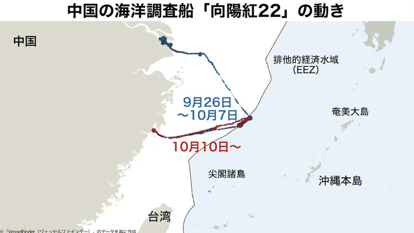 政府筋によると、9月12日には「向陽紅03」が同海域で活動、10月1日には「向陽紅18」が尖閣諸島付近のEEZ内を航行している。