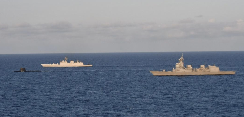 図25:(海上幕僚監部)10月16日〜18日の間東シナ海で共同訓練をする日印鑑。右から「あさひ」、「サヒヤードリ」、黒く見えるのが海自潜水艦。
