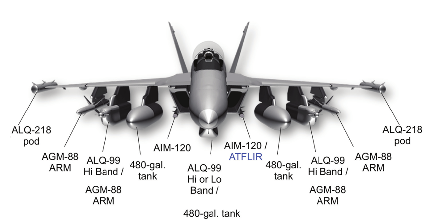 図34:(reddit) EA-18G グロウラー(Growler)の標準的な搭載装置。内翼下面の480 ガロン燃料タンクが目立つ。