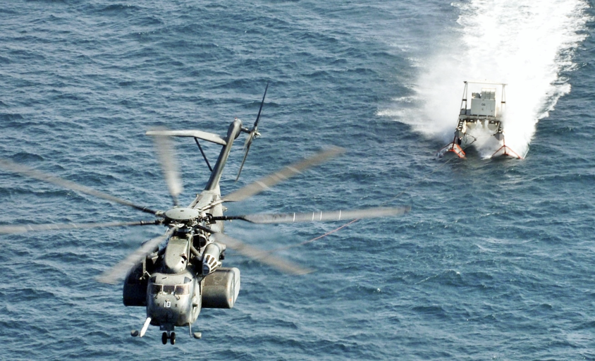 図19:(U.S. Navy photo by Lt. Comdr. John L. Kline)Mk 105磁気掃海具を曳航するMH-53Eシードラゴン・ヘリコプター。最大離陸重量31.6 ton、巡航速度280 km/hr、最大曳航能力(掃海用具)11.2 ton、高速距離1,200 km。
