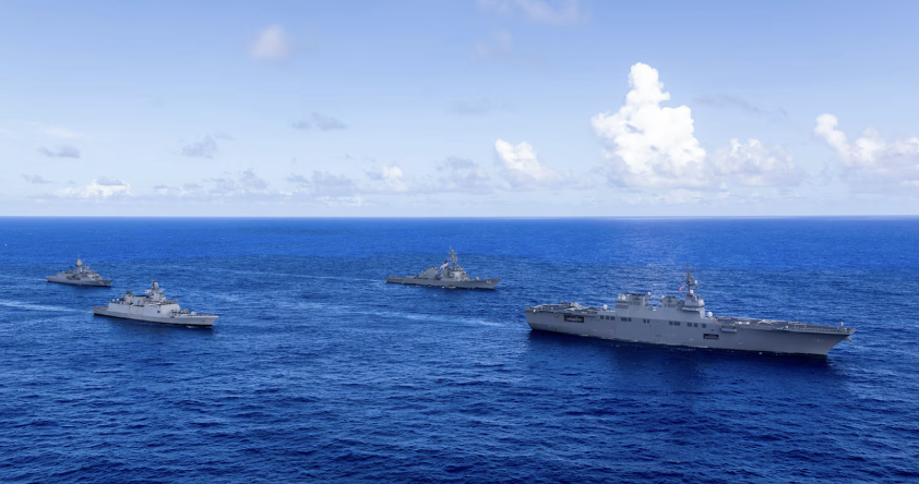 図22:グアム周辺で行われたオーストラリア、インド、日本、米国、4カ国共同訓練「マラバール2025」の様子。海自ヘリ空母「ひゅうが」(右)を先頭に米海軍ミサイル駆逐艦「フィッツジェラルド」、インド海軍フリゲート「サヒヤードリ」、オーストラリア海軍フリゲート「バララット」(左)の順。