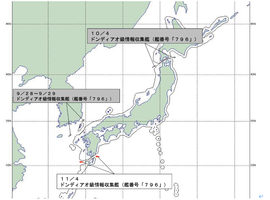 • 11月4日 発表 中国海軍情報収集艦、太平洋から大隈海峡を通過、東シナ海へ