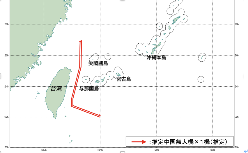 11月24日、午前から午後にかけて中国軍無人機が与那国島―台湾間の海峡を通過太平洋に進出、台湾東の海上を飛行した後、反転、往路と同じ経路で東シナ海に戻った。
