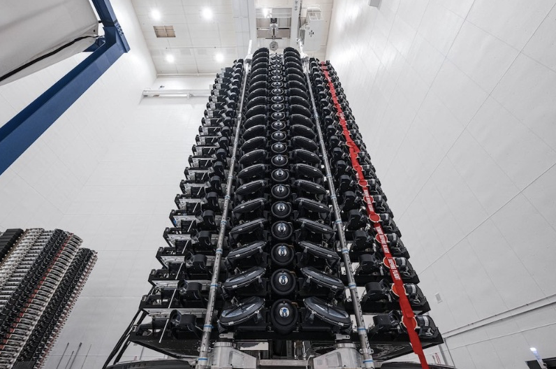図12:(SpaceX)次世代アウターリンク衛星「V2 Mini」。2023年2月から第2世代衛星の先行型「V2 Mini」の打上げが始まった。20基以上の衛星を積み重ね「ファルコン9」ロケットで打上げる。第2世代衛星は周波数の高いEバンド(60~80 GHz帯)を使うので通信容量が第1世代改良版「V 1.5」の4倍になる。