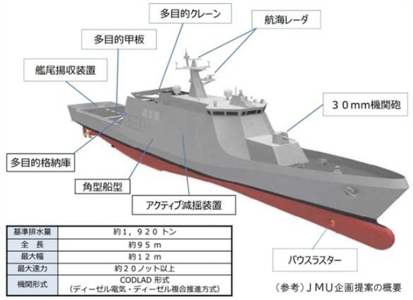 基準排水量は1,900 ton、艦尾にはヘリコプター発着に対応した多目的甲板、低速で長期間監視を行うため減搖水槽を装備する。艦首にはバウスラスターがあり、タグボートの助け無しに独力で接岸できる。推進機関は、CODLAD方式、巡航時はジーゼル・エレクトリック電気推進、高速時にはジーゼル・エンジンで機械駆動方式で航行する。最大速力は25 kts。兵装は艦首に30 mm機関砲1門、と現在開発中のコンテナ収納式対艦ミサイルを搭載する予定。多目的甲板からは米国Shield AI社開発のVTOL式無人機「MQ-35A」V-BATの運用を決めている。(2025年度予算で6機発注済み。