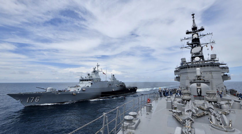 海上自衛隊:ミサイル駆逐艦(イージス艦)「まや (DDG 179)」満載排水量10,250 ton、Mk 41 VLS 96セル、対艦ミサイル90式/17式4連装発射筒2基などを装備、補給艦「はまな (AOE 424)」満載排水量12,150 ton、長さ167 m、速力22 kts、1990年就役。