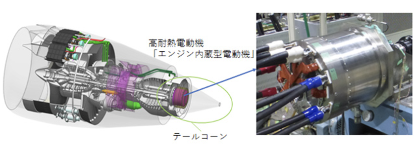 図10:(IHIニュース2024-1-12)左はIHIが進めているテールコーン内蔵型4 MW級電動モーターの概念。右は試験中の1MW級電動モーターの写真。