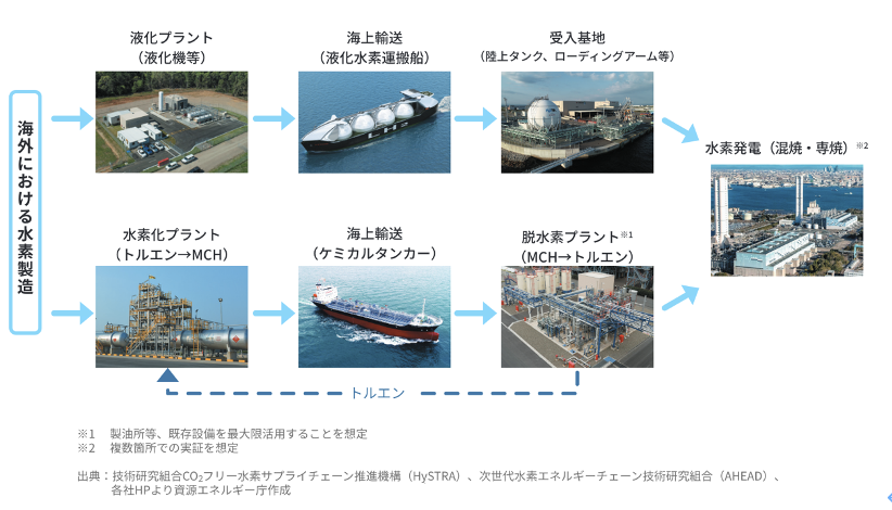 水素は航空機だけでなく、一般電力分野で脱炭素化に貢献でき、余剰電力を水素に変換して貯蔵・再利用もできる、2時エネルギーとして期待されている。このために既存のインフラを利用しつつ水素供給浪の増大と利用の創出を行う社会を作ろうとしている。具体的には「海外での水素製造プラント」、「液化水素運搬船」、「海上タンクを含む受入基地」、「水素発電設備」、の整備・拡充が必要になる。