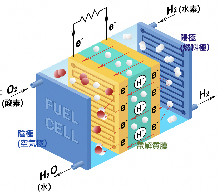 燃料電池とは、燃料/水素と酸化剤/酸素で生じる化学エネルギーを、酸化還元反応によって電気に変換する装置である。この化学反応を維持するため、つまり電気エネルギーを連続して出すためには、燃料/水素と酸化剤/酸素を継続的に供給する必要がある。燃料電池は一般の電池のように電力を蓄えることはできない。