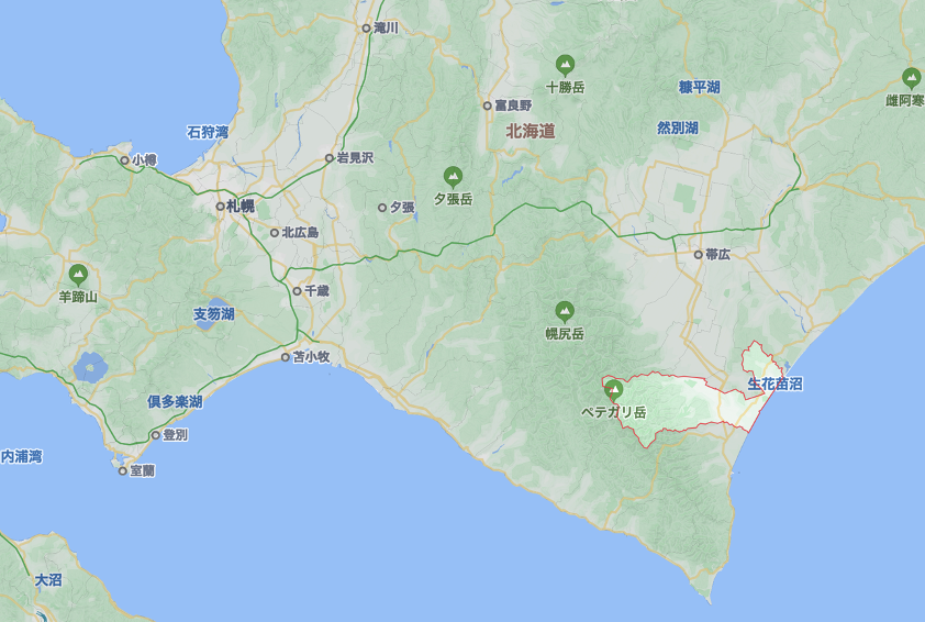 図5:(Google Map)北海道大樹町の位置。帯広の南60 kmにある。「大樹町多目的航空公園」内の「北海道スペースポート(HOSPO)」は南/東の方向が海に面しておりロケット発射場として好適な場所。