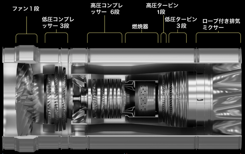 離陸推力40,000 lbs、「オーバーチェア」に4基装備しマッハ1.7の速度で飛行する。燃料は100 % SAF(sustainable aviation fuel/環境適合航空燃料)も使用できる。
